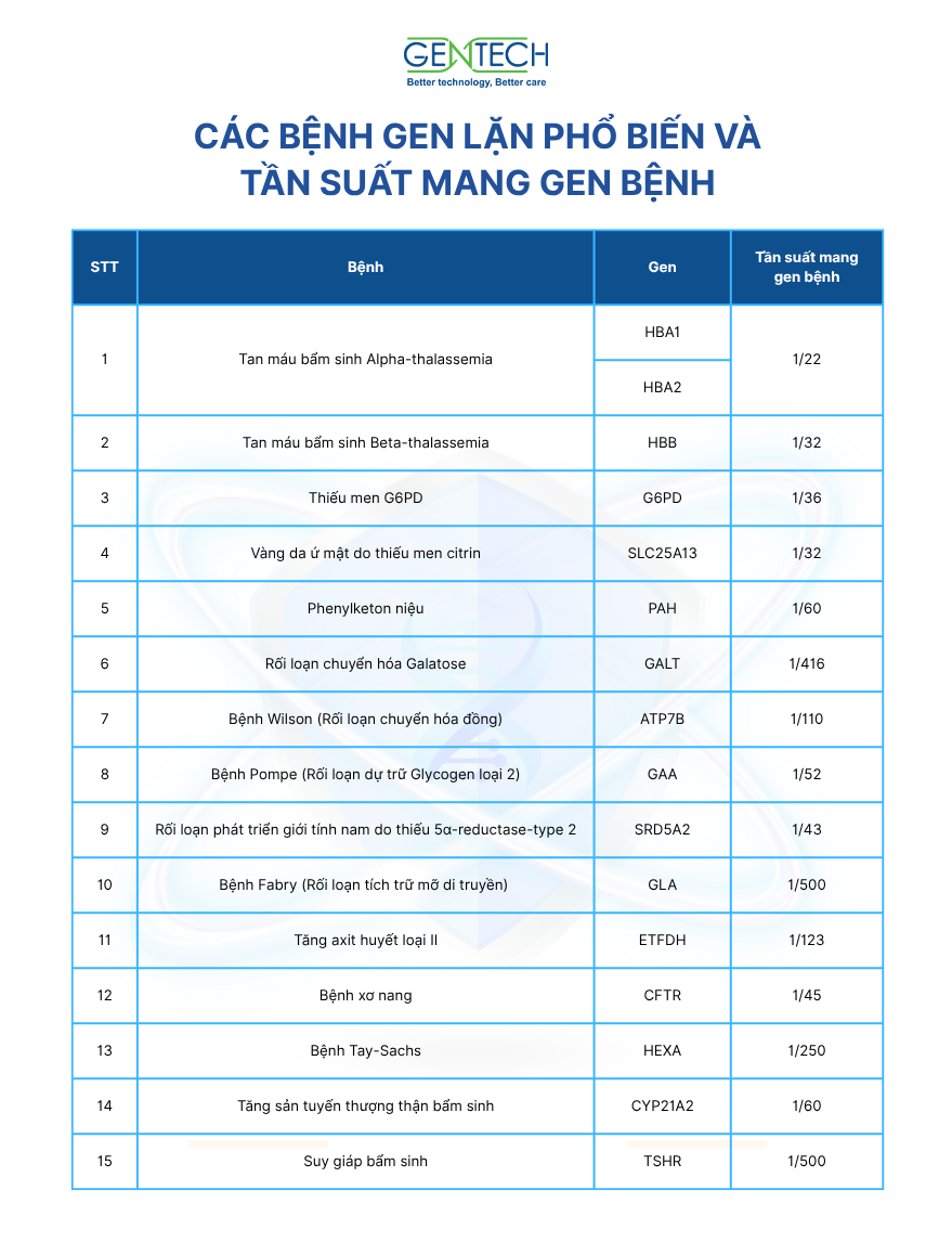 Xét nghiệm sàng lọc người lành mang gen bệnh (Carrier Screening) tại GENTECH giúp phát hiện sớm nguy cơ này, từ đó hỗ trợ các cặp đôi chủ động kế hoạch sinh con an toàn.